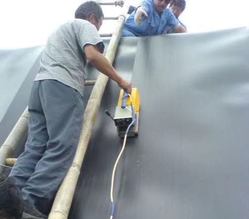 3 焊接施工:使用土工膜焊接機,有的施工人員,按照要求將搭接好的土工膜,焊接成一塊整體,